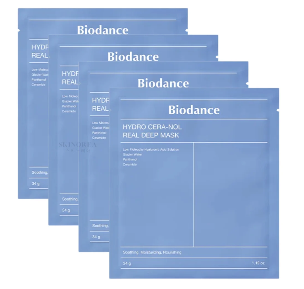 Biodance – Hydro Cera-Nol Real Deep Mask – 1 boîte (4 masques × 34 g) – un masque premium en hydrogel conçu pour offrir une hydratation profonde, apaiser la peau et renforcer la barrière cutanée. Présenté en coffret de quatre masques, ce soin procure un traitement intensif idéal pour les peaux sèches, sensibles ou fragilisées.